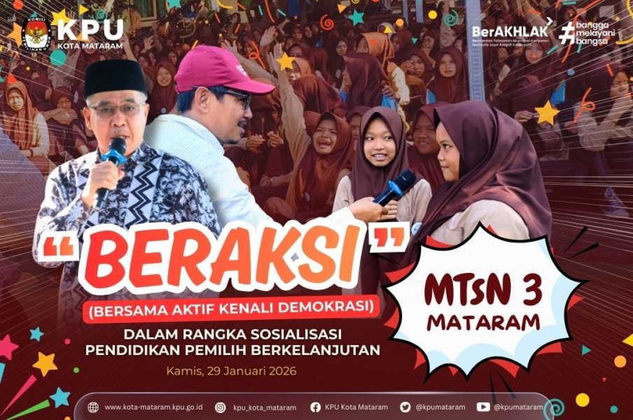 #temanpemilih, (29/01) KPU Kota Mataram melaksanakan kegiatan Sosialisasi pendidikan pemilih pemula berkelanjutan di MTsN 3 Mataram, pada Kamis, 29 Januari 2026. Kegiatan ini dihadiri oleh seluruh siswa dan siswi yang antusias menyambut informasi seputar demokrasi dan Pemilu. Ketua Divisi Sosialisasi, Pendidikan Pemilih, Partisipasi Masyarakat, dan SDM KPU Kota Mataram, Muslih Syuaib, hadir sebagai narasumber utama, didampingi oleh Kepala Subbagian Parmas dan SDM beserta staf, serta mahasiswa Praktik Kerja Lapangan (PKL). Beraksi kali ini merupakan pendampingan dari rangkaian kegiatan pemilihan ketua dan wakil ketua Orsima MTsN 3 Mataram. Dalam pemaparannya, Bapak Muslih Syuaib memperkenalkan kepada para pemilih pemula mengenai bentuk demokrasi dan menceritakan mengenai tahapan pemilihan. Beliau menyatakan penting untuk menggunakan hak suara kita dan tidak disia-siakan, agar kita bisa memilih calon pemimpin yang tepat. Di akhir sesi, Bapak Muslih Syuaib memberikan pertanyaan yang dijawab dengan cermat dan antusias oleh para siswa, menandakan pemahaman yang baik. #kpumelayani #kpukotamataram ....