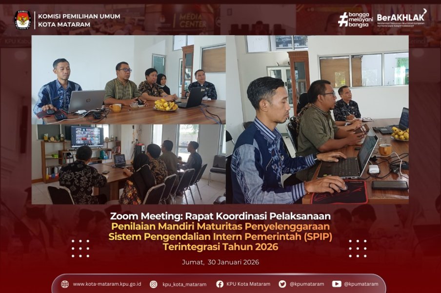 #temanpemilih, Jumat (30/1/2026), KPU Kota Mataram mengikuti Rapat Koordinasi Pelaksanaan Penilaian Mandiri Maturitas Penyelenggaraan Sistem Pengendalian Intern Pemerintah (SPIP) Terintegrasi Tahun 2026 secara daring. Kegiatan ini dibuka secara resmi oleh Ibu Iffa Rosita (Anggota KPU RI/Ketua Divisi Hukum dan Pengawasan), didampingi oleh Bapak Nanang Priyatna (Inspektur Utama KPU RI). Hadir mewakili KPU Kota Mataram dalam Rapat Koordinasi ini: Ketua KPU Kota Mataram, Edy Putrawan, Anggota KPU Kota Mataram Divisi Hukum dan Pengawasan, Achmad Naufal Rochmatulloh, Sekretaris KPU Kota Mataram, Lalu Agus Suhardiman, Kasubbag. Teknis Penyelenggaraan Pemilu dan Parhupmas, Moch. Wahyurridho & Staf Teknis Penyelenggaraan dan Parhupmas Untuk memantapkan standar pengawasan, hadir narasumber ahli dari Badan Pengawasan Keuangan dan Pembangunan (BPKP). Beliau memaparkan Gambaran Umum & Kebijakan SPIP serta Teknis Pengisian Kertas Kerja. Setelah diskusi intensif, rapat resmi ditutup pada pukul 16.45 WITA oleh Bapak Haji Sumarjono yang mewakili Inspektur Utama KPU RI. Dengan partisipasi aktif ini, KPU Kota Mataram terus berupaya menghadirkan lembaga yang tidak hanya bekerja keras, tetapi juga bekerja dengan sistem pengawasan yang kuat dan terukur. #kpumelayani #kpukotamataram ....