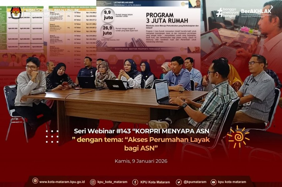 #temanpemilih, (08/12) Aparatur Sipil Negara (ASN) Komisi Pemilihan Umum Kota Mataram ikuti secara virtual Seri Webinar-143 KORPRI Menyapa ASN dengan tema "KORPRI Menyapa ASN : Akses Perumahan Layak bagi ASN" yang dilaksanakan oleh Dewan Pengurus KORPRI Nasional pada hari Kamis, 8 Januari 2026.