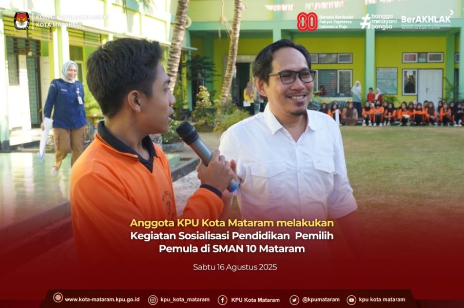 #temanpemilih, (16/8). Ketua Divisi Sosialisasi Pendidikan Pemilih, Partisipasi Masyarakat dan Sumber Daya Manusia (Sosdiklih Parmas dan SDM), KPU Kota Mataram, Muslih Syuaib, menjadi narasumber dalam kegiatan sosialisasi pendidikan bagi pemilih  pemula pada Sabtu (16/8/2025). Kegiatan yang dilaksanakan di halaman sekolah tersebut diikuti oleh seluruh  siswa dan siswi yang bertepatan juga dengan kegiatan perlombaan dalam  menyambut hari kemerdekaan Republik Indonesia ke 80, selain itu SMAN 10 Mataram merayakan hari jadi nya yang ke 8 tahun.   Arzusma subhan, S.Pd, Waka humas SMAN 10 Mataram  menyampaikan apresiasi atas kehadiran KPU Kota Mataram dalam memberikan sosialisasi pendidikan pemilih pemula bagi Siswa dan Siswi SMAN 10 Mataram yang akan ikut berkontribusi dalam Pemilu dan Pilkada. Di masa yang akan datang.  Ketua Divisi Sosdiklih Parmas dan SDM, Muslih Syuaib berpesan bahwa pemilih pemula berperan penting dalam menentukan kualitas demokrasi di masa mendatang." Ia menambahkan, "melalui kegiatan semacam ini, kami berharap para siswa/i lebih mengerti arti memilih dan bertanggung jawab atas pilihannya." Para siswa/i menunjukkan antusiasme luar biasa saat mengikuti proses sosialisasi pendidikan pemilih pemula di SMAN 10 Mataram.  #kpumelayani #kpukotamataram