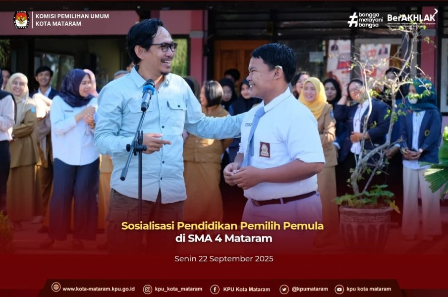 #temanpemilih, (22/9) Ketua Divisi Sosialisasi, Pendidikan Pemilih, Partisipasi Masyarakat dan SDM KPU Kota Mataram, Muslih Syuaib, menjadi narasumber dalam kegiatan Sosialisasi Pendidikan Pemilih Pemula pada hari Senin, 22 September 2025. Kegiatan dilaksanakan di halaman sekolah SMAN 4 Mataram yang diikuti oleh para siswa dan siswi. Kepala Sekolah SMAN 4 Mataram, Bapak Jauhari Khalid, menyampaikan apresiasi atas kehadiran KPU Kota Mataram dalam memberikan sosialisasi pendidikan pemilih pemula bagi siswa dan siswi SMAN 4 Mataram yang akan ikut berkontribusi dalam Pemilu dan Pilkada di masa yang akan datang. Ketua Divisi Sosialisasi, Pendidikan Pemilih, Partisipasi Masyarakat dan SDM KPU Kota Mataram, Muslih Syuaib, berpesan bahwa "Pemilih pemula adalah calon pemimpin masa depan dan pertama kalinya memberikan suara dalam pemilu/pemilihan di masa yang akan dating Sehingga perlu diberi pemahaman yang baik tentang demokrasi "penting untuk menggunakan hak suara kita dan untuk tidak di sia-sia kan, jangan sampai kita kecewa dengan siapa yang kita pilih. Salah satu pelanggaran yang sering kita temui adalah penyalahgunaan hak pilih. Mulai dari adanya money politik dan golput. Muslih syuaib juga mengajak para siswa siswi untuk ikut berkontribusi menggunakan hak pilihnya di pemilu/ pemilihan yang akan datang untuk jangan sampai golput karena setiap diri kita memiliki hak pilih yang sama dan bertanggung jawab atas apa yang kita pilih." Pilihan kita ini akan mencetak pemimpin-pemimpin bangsa yang baik dimasa yang akan datang jika kita salah memilih pemimpin maka kita akan terima konsekuensi nya mendapatkan pemimpin yang buruk, dan cara memberikan punishment bagi pemimpin yang buruk dengan tidak memilihnya lagi di pemilu/pemilihan selanjutnya. Seluruh siswa/i menunjukkan antusiasme luar biasa saat mengikuti kegiatan sosialisasi yang telah diselenggarakan. #kpumelayani #kpukotamataram