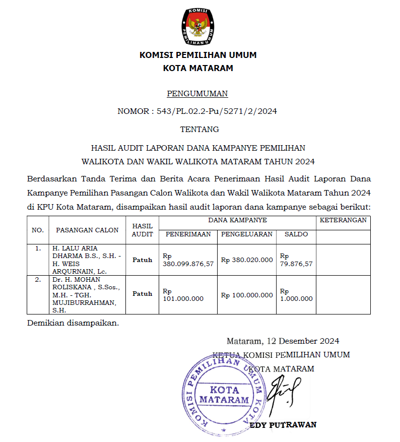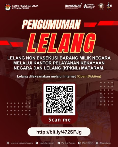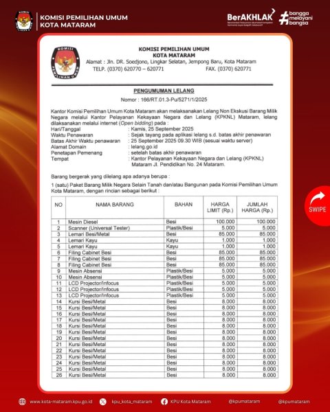 #temanpemilih (22/8/2025), KPU Kota Mataram akan melaksanakan Lelang Logistik Pasca Pemilihan 2024 berupa Kotak Suara, Bilik Suara, Surat Suara, dan Surat Suara PSU Pemilihan Gubernur dan Wakil Gubernur Nusa Tenggara Barat serta Walikota dan Wakil Walikota Mataram Tahun 2024 pada tanggal 28 Agustus 2025 melalui internet (open bidding) dengan alamat domain lelang.go.id jam 09.20 WIB (sesuai waktu server), bertempat di Kantor Pelayanan Kekayaan Negara dan Lelang (KPKNL) Mataram #kpumelayani #kpukotamataram