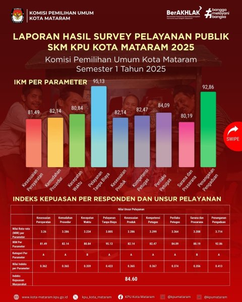 #temanpemilih, (22/9) KPU Kota Mataram memperoleh Indeks Kepuasan Masyarakat (IKM) sebesar 84,60 yang diperoleh dari hasil tindak lanjut pelaksanaan Survey Kepuasan Masyarakat (SKM) KPU Kota Mataram Tahun 2025. KPU Kota Mataram menyampaikan banyak terima kasih atas partisipasi masyarakat yang telah meluangkan waktunya dalam mengisi survey tersebut, serta kami berjanji akan terus melakukan evaluasi untuk menciptakan pelayanan yang terbaik dan memuaskan. #kpumelayani #kpukotamataram