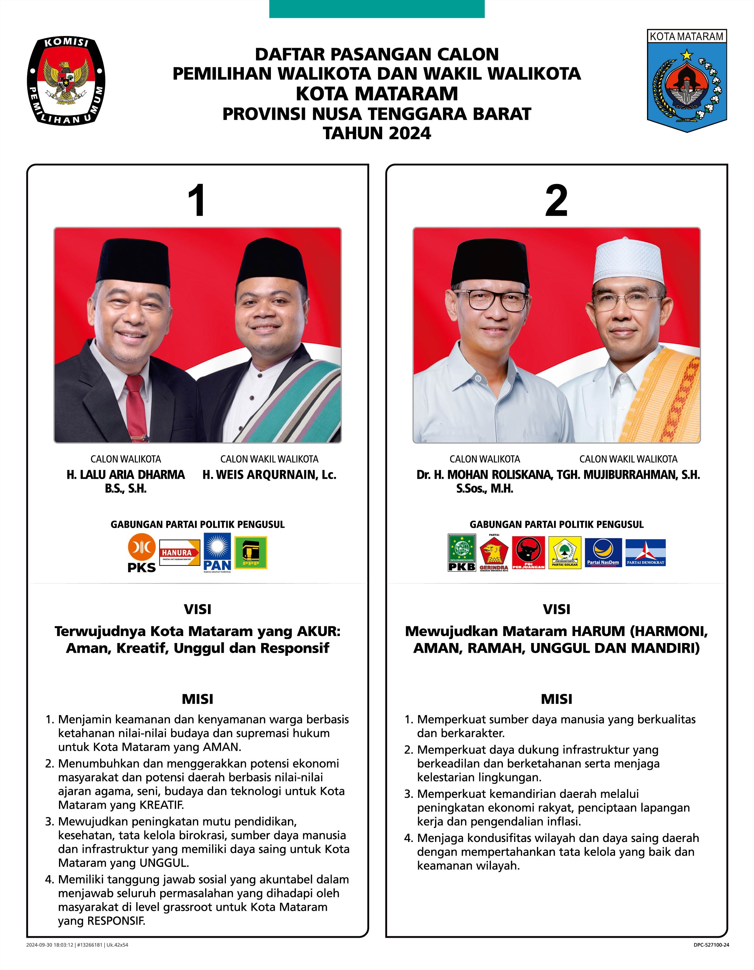 DAFTAR PASANGAN CALON PADA PEMILIHAN WALIKOTA DAN WAKIL WALIKOTA MATARAM TAHUN 2024 Jumat, 04 Oktober 2024 07:00 1003 #Teman Pemilih, Berikut kami sampaikan Daftar Pasangan Calon Walikota dan Wakil Walikota Mataram Tahun 2024 Baca Selengkapnya