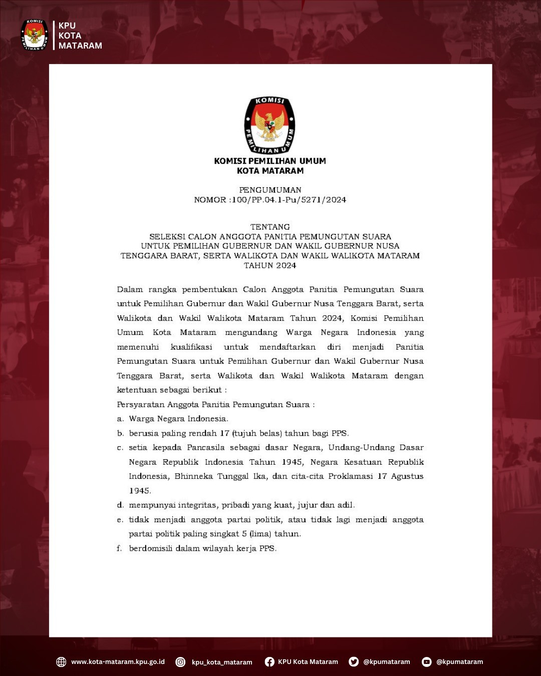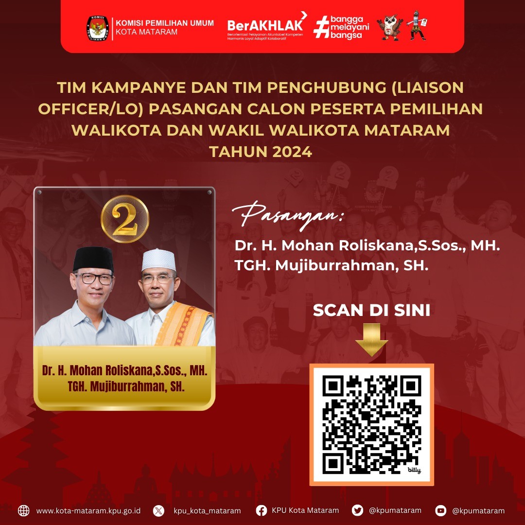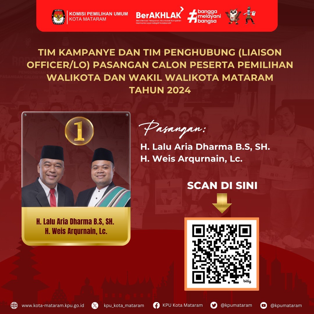 #temanpemilih (25/9), KPU Kota Mataram mengumumkan Nama Tim Kampanye dan Tim Penghubung (Liaison Officer/LO) Pasangan Calon peserta Pemilihan Walikota dan Wakil Walikota Mataram Tahun 2024.