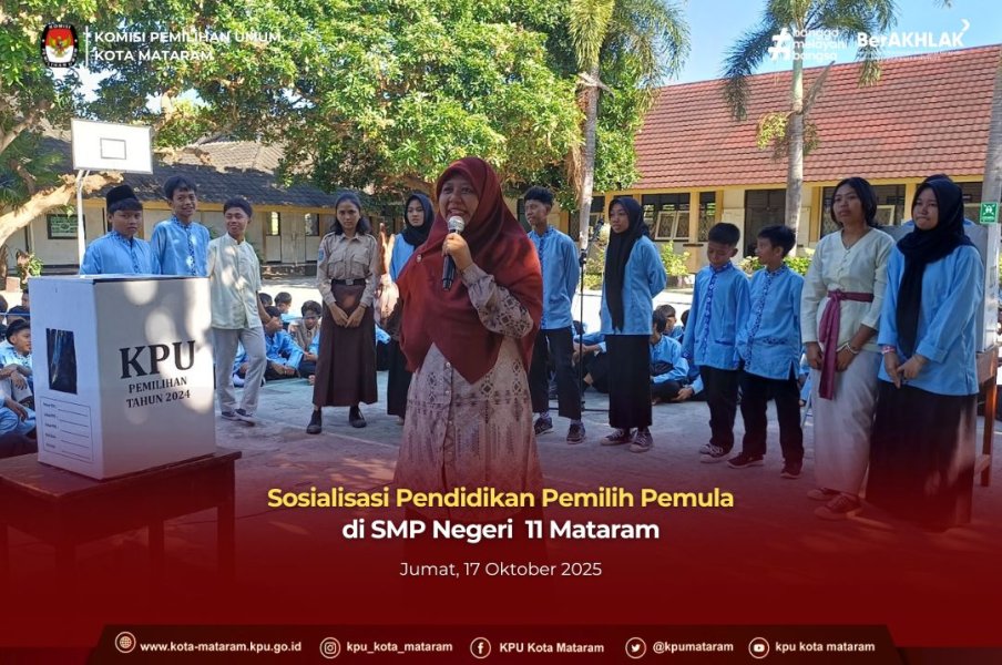 #temanpemilih, (17/10) KPU Kota Mataram terus bergerak mendekatkan diri dengan Pemilih Pemula! Kali ini, tim dari KPU mengunjungi SMPN 11 Mataram untuk menggelar kegiatan Sosdiklih (Sosialisasi Pendidikan Pemilih) berkelanjutan pada hari Jum'at, 17 Oktober 2025.