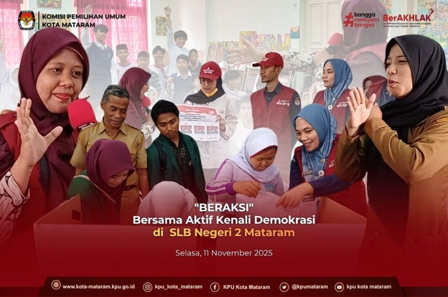 #temanpemilih, (11/11/2025) KPU Kota Mataram menggelar Sosialisasi dan Pendidikan Pemilih (Sosdiklih) berkelanjutan yang menyentuh segmen pemilih di Sekolah Luar Biasa Negeri (SLBN) 2 Mataram. Sosialisasi yang dilaksanakan pada hari Selasa, 11 November 2025 ini merupakan wujud nyata komitmen KPU dalam memastikan hak pilih seluruh masyarakat terlindungi.