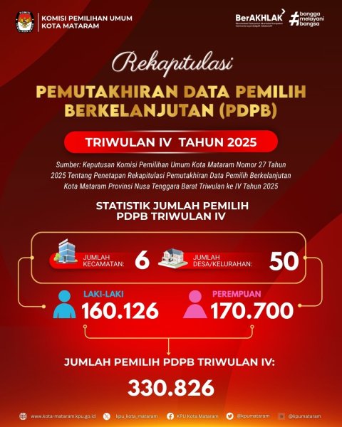 #temanpemilih, (08/12) Infografis Hasil Rekapitulasi Data Pemilih Berkelanjutan (PDPB) Triwulan IV Tahun 2025 di tingkat Kota Mataram.