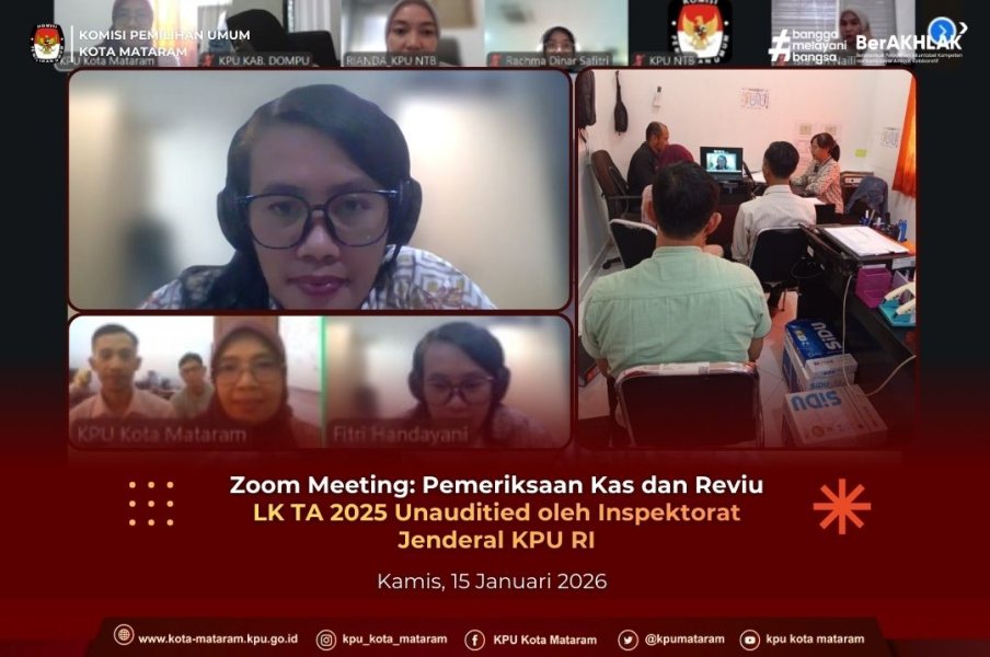 KPU Kota Mataram mengikuti pelaksanaan kegiatan pemeriksaan kas tahun 2026 yang dilaksanakan oleh KetuaTim Inspektorat Utama Setjen KPU RI, ibu Fitri Handayani, secara daring melalui zoom meeting.