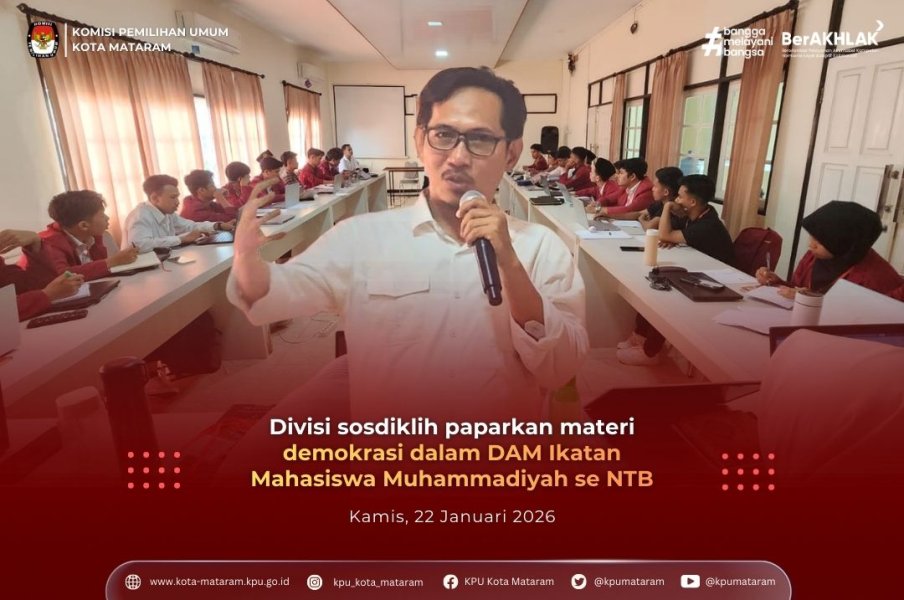 #temanpemilih, (22/02) Ketua Divisi Sosialisasi, Pendidikan Pemilih, Partisipasi Masyarakat, dan SDM KPU Kota Mataram Muslih Syuaib, menjadi pemateri dalam kegiatan Darul Arqam Madya (DAM) Ikatan Mahasiswa Muhammadiyah (IMM) tingkat regional se–Nusa Tenggara Barat (NTB) yang diselenggarakan di Kampus II Universitas Mataram.