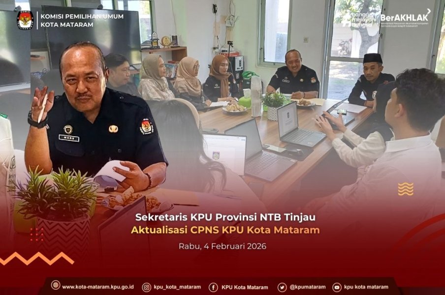 #TemanPemilih, Sekretaris KPU Provinsi NTB, Bapak Mars Ansori Wijaya, melakukan kunjungan kerja ke Kantor KPU Kota Mataram pada Rabu (4/2/2026). Kedatangan rombongan disambut langsung oleh Sekretaris KPU Kota Mataram bersama Kepala Subbagian guna memantau perkembangan peserta Pelatihan Dasar (Latsar) CPNS KPU Kota Mataram.