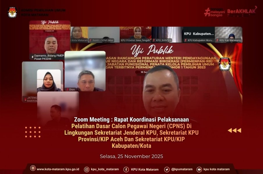 #temanpemilih, (27/11/2025) Aparatur Sipil Negara (ASN) Komisi Pemilihan Umum Kota Mataram ikuti secara virtual Seri Webinar Dalam rangka memperingati HUT Ke-54 KORPRI Tahun 2025 bertema: "Membangun Sistem Perlindungan dan Kesejahteraan ASN untuk Pelayanan Publik yang Berkelanjutan" yang dilaksanakan oleh Dewan Pengurus KORPRI Nasional pada hari Kamis, 27 November 2025.