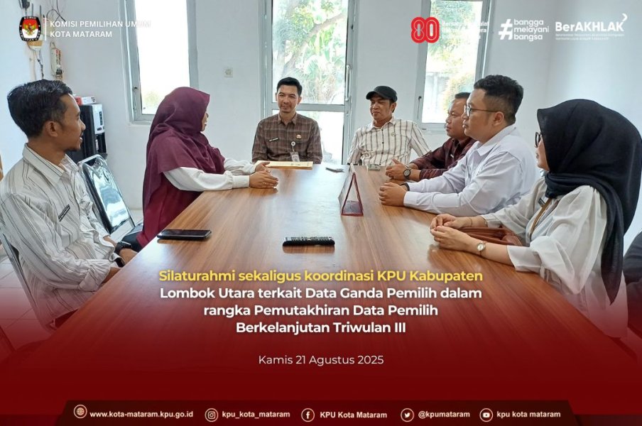#temanpemilih (21/8/2025), KPU Kabupaten Lombok Utara mengadakan koordinasi dan silaturahmi dengan KPU Kota Mataram pada Kamis, 21 Agustus 2025. Pertemuan ini bertujuan untuk membahas data ganda dalam rangka Pemutakhiran Data Pemilih Berkelanjutan (PDPB) triwulan III tahun 2025. Rombongan dari KPU Kabupaten Lombok Utara dipimpin oleh Ketua KPU Kabupaten Lombok Utara, Nizamudin, didampingi oleh Kadiv. Perencanaan, Data dan Informasi, Bambang Wahyudi, serta Plt. Sekretaris KPU Kabupaten Lombok Utara, Didi F. Sanusi. Turut hadir staf dan CPNS dari Sub Bagian Perdatin. Mereka diterima oleh KPU Kota Mataram, yaitu Kadiv. Perencanaan, Data dan Informasi, Dwi Ratnasari Yulianingsih,S. Kadiv. Sosdiklih, Parmas, dan SDM, Muslih Syuaib, Sekretaris KPU Kota Mataram, Lalu Agus Suhardiman, serta Kasubag Perencanaan, Data dan Informasi, Aprilia Irma Prihatini. Pertemuan ini menjadi langkah penting untuk pengendalian kualitas data pemilih. Harapannya, proses PDPB triwulan III tahun 2025 dapat menghasilkan data yang lebih akurat, mutakhir, dan valid. #kpumelayani #kpukotamataram