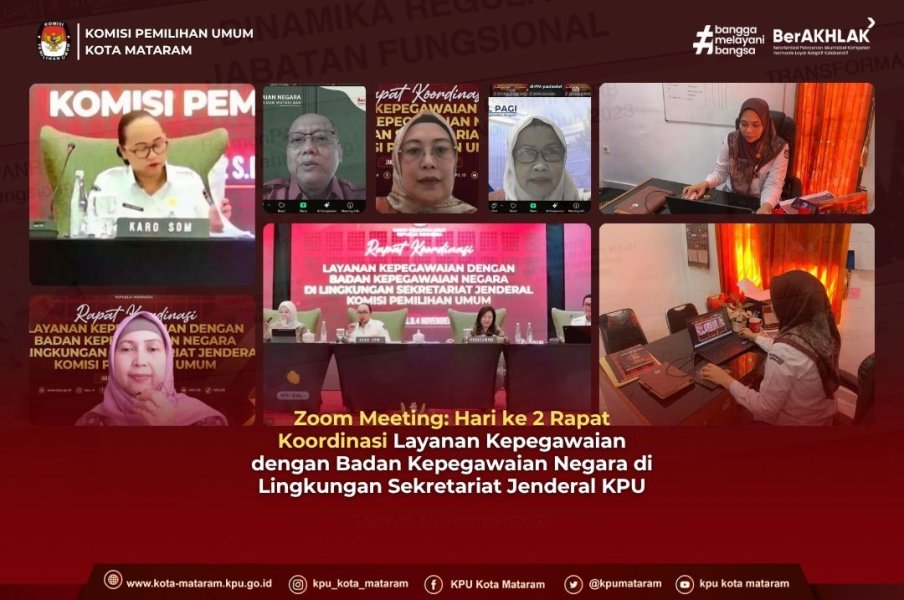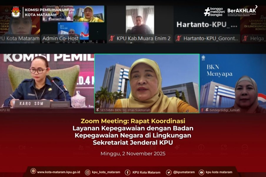 #temanpemilih, (2/11/2025) Komisi Pemilihan Umum Kota Mataram mengikuti Rapat Koordinasi (Rakor) Layanan Kepegawaian secara virtual melalui Zoom Meeting, diselenggarakan oleh Sekretariat Jenderal KPU RI. Rakor ini merupakan kolaborasi strategis antara KPU RI dengan Badan Kepegawaian Negara (BKN) dalam rangka penguatan pengelolaan Aparatur Sipil Negara (ASN) di lingkungan Sekretariat Jenderal KPU. Pelaksanaan tanggal 2 s.d 4 November 2025. di ikuti Kepala Sub Bagian yang membidangi Sumber Daya Manusia (SDM) dari seluruh Sekretariat KPU Provinsi/KIP Aceh dan Sekretariat KPU/KIP Kabupaten/Kota se-Indonesia. Rakor dibuka secara resmi oleh Kepala Biro Sumber Daya Manusia Sekretariat Jenderal KPU RI, Yuli Hertaty. Kegiatan ini bertujuan untuk memastikan pengelolaan kepegawaian berjalan secara profesional, efektif, dan sesuai dengan peraturan perundang-undangan yang berlaku, serta untuk mencapai tujuan sebagai berikut: 1. Koordinasi pengelolaan layanan ASN di Sekretariat KPU. 2. Pembaruan (Update) informasi mengenai aturan kepegawaian terkini. 3. Optimalisasi penggunaan aplikasi My ASN dan aplikasi kepegawaian lainnya untuk mendukung layanan kepegawaian yang prima. Sesi Hari Pertama: Paparan dari Pejabat Tinggi BKN Rakor hari pertama diisi oleh dua narasumber dari BKN, 1. Sekretaris Utama BKN, Hj. Imas Sukmariah. Tema : Peran dan Produk Layanan BKN dalam Manajemen ASN dan Program Strategis Pengawasan dan Pengendalian melalui I-Mut. 2. Sekretaris Deputi Bidang Sistem Informasi dan Digitalisasi Manajemen ASN, Jumiati. Tema : Tugas, Fungsi, dan Peran BKN dalam Digitalisasi Manajemen ASN. Pengelolaan SDM yang profesional sangat krusial dalam mendukung integritas dan kinerja KPU. Rakor ini diharapkan dapat menyelaraskan pemahaman dan implementasi kebijakan kepegawaian di seluruh tingkatan KPU. #kpumelayani #kpukotamataram