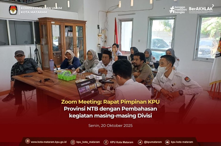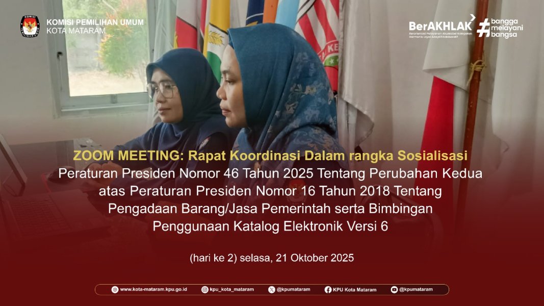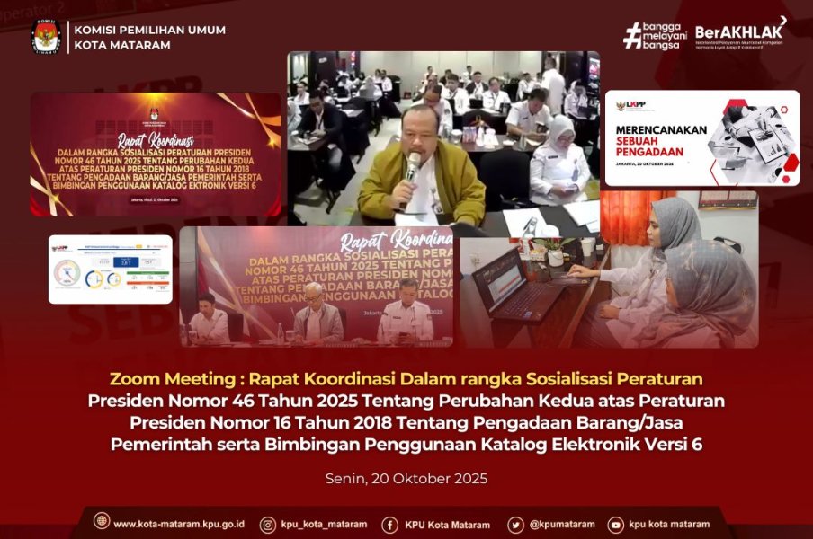 #temanpemilih, (20/10/2025) PPK dan PBJ KPU kota Mataram mengikuti zoom dengan metode online meeting, rapat Koordinasi dalam rangka Sosialisasi Peraturan Presiden Nomor 46 Tahun 2025 tentang Perubahan Kedua atas Peraturan Presiden Nomor 16 Tahun 2018 tentang Pengadaan Barang/Jasa Pemerintah serta Bimbingan Teknis Penggunaan Katalog Elektronik Versi 6 berlangsung Senin, 20 Oktober 2025. Narasumber Kegiatan dari Biro Pengadaan Barang/Jasa dan Barang Milik Negara KPU, Direktorat Advokasi Pemerintah Pusat memberikan materi tentang Sosialisasi Perpres Nomor 46 Tahun 2025 tentang Perubahan Kedua atas Perpres Nomor 16 Tahun 2018 tentang Pengadaan Barang/Jasa Pemerintah LKPP sedangkan Direktorat Perencanaan Transformasi, Pemantauan, dan Evaluasi Pengadaan, LKPP memberikan materi tentang Pemaketan dan Pengumuman Rencana Umum Pengadaa (RUP) dan materi Monitoring Penginputan Sistem Informasi Rencana Umum Pengadaan (SiRUP). Peserta diharapkan berpartisipasi aktif selama kegiatan ini Pelaksanaan kegiatan Sosialisasi Peraturan Presiden Nomor 46 Tahun 2025 berlangsung dari tanggal 19 s.d 22 oktober 2025. #kpumelayani #kpukotamataram