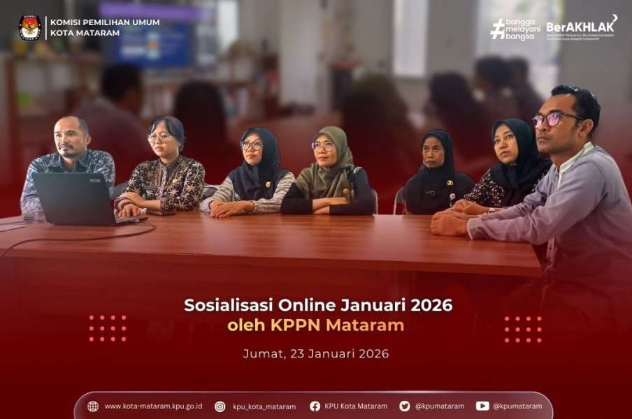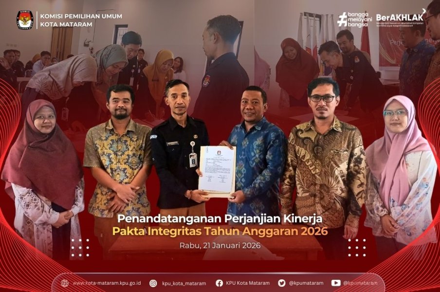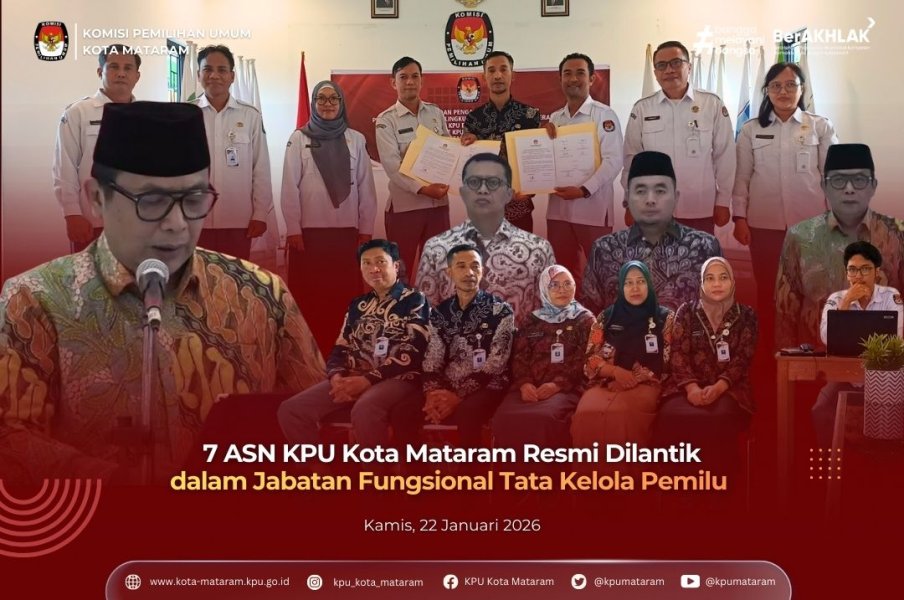#temanpemilih, Sekretariat Jenderal Komisi Pemilihan Umum Republik Indonesia terus berkomitmen meningkatkan kualitas pelayanan publik dan profesionalisme lembaga. Sekretariat KPU Kota Mataram mengikuti prosesi Pelantikan dan Pengambilan Sumpah/Janji Jabatan Fungsional Tata Kelola Pemilu di Lingkungan Sekretariat Jenderal KPU, Sekretariat KPU Provinsi/KIP Aceh dan Sekretariat KPU/KIP Kabupaten/Kota Tahun 2026 secara daring pada Kamis (22/1/2026). Kegiatan yang diselenggarakan oleh Sekretariat Jenderal KPU RI ini dipimpin langsung oleh Sekretaris Jenderal KPU RI, Bernad Dermawan Sutrisno. Hadir secara langsung di Ruang Rapat KPU Kota Mataram, Sekretaris KPU Kota Mataram bersama jajaran Kepala Sub Bagian serta seluruh ASN Sekretariat KPU Kota Mataram untuk memberikan dukungan penuh kepada rekan-rekan yang dilantik. Pelantikan dan Pengambilan Sumpah/Janji ini bertujuan untuk Optimalisasi Kinerja,Tata Kelola Akuntabel, serta Penguatan Kelembagaan. Setelah prosesi pelantikan, Sekretaris Jenderal KPU RI, Bernad Dermawan Sutrisno, dan Ketua KPU RI, Mohammad Afifuddin, memberikan arahan penting. Acara ditutup dengan penandatanganan Berita Acara Pelantikan, pemberian ucapan selamat, serta sesi foto bersama. Selamat mengemban amanah baru kepada Pejabat Fungsional Tata Kelola Pemilu di Lingkungan Sekretariat KPU Kota Mataram: 1. Firdaus Anshori 2. Anwar 3. Lalu Pujiatna 4. Fatmaniatun Ulfasari 5. Ni Putu Anggarini Pratiwi 6. Beknadetus Sigit Widada 7. Lalu Supardan #kpumelayani #kpukotamataram
