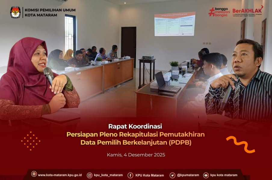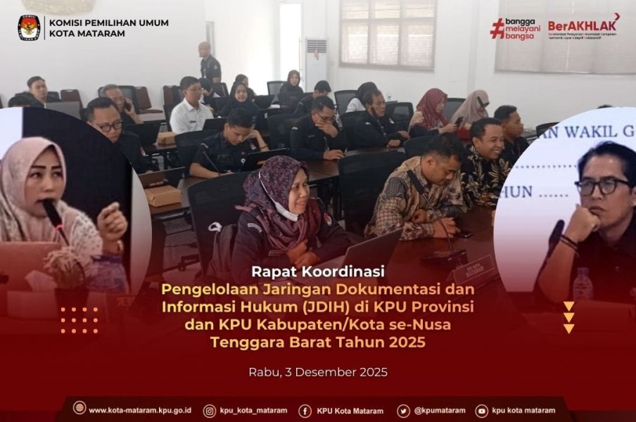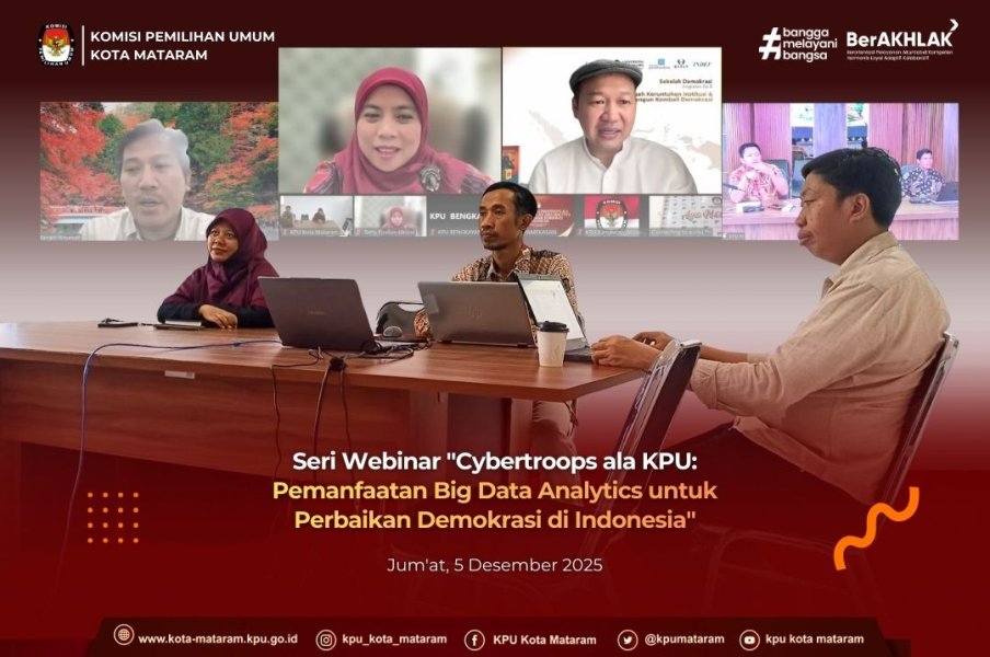 #temanpemilih, (5/12/2025) KPU Kota Mataram mengikuti kegiatan Webinar Series yang diselenggarakan oleh KPU Republik Indonesia (RI) melalui platform Zoom Meeting. Webinar ini mengusung tema "Cybertroops ala KPU: Pemanfaatan Big Data Analytics untuk Perbaikan Demokrasi di Indonesia" dan dilaksanakan secara daring (online) dengan melibatkan seluruh KPU Provinsi serta KPU Kabupaten/Kota di seluruh Indonesia. Kegiatan ini menghadirkan narasumber dari akademisi Universitas Diponegoro Semarang, yaitu: Wijayanto, S.IP., M.Si., Ph.D., selaku Wakil Rektor IV Bidang Riset, Inovasi, Kerja Sama, dan Komunikasi Publik. Bangkit A. Wiryawan, S.Sos., M.A., Ph.D. Kegiatan ini bertujuan untuk meningkatkan pemahaman dan kapasitas KPU di berbagai tingkatan mengenai pemanfaatan Big Data Analytics dalam konteks kepemiluan dan perbaikan demokrasi. Dari KPU Kota Mataram, dihadiri oleh Anggota KPU Kota Mataram, Dwi Ratnasari Yulianingsih S, selaku Ketua Divisi Perencanaan, Data, dan Informasi. Sekretaris KPU Kota Mataram, Lalu Agus Suhardiman yang didampingi oleh Kepala Sub Bagian Teknis. Moch. Wahyurridho #kpumelayani #kpukotamataram