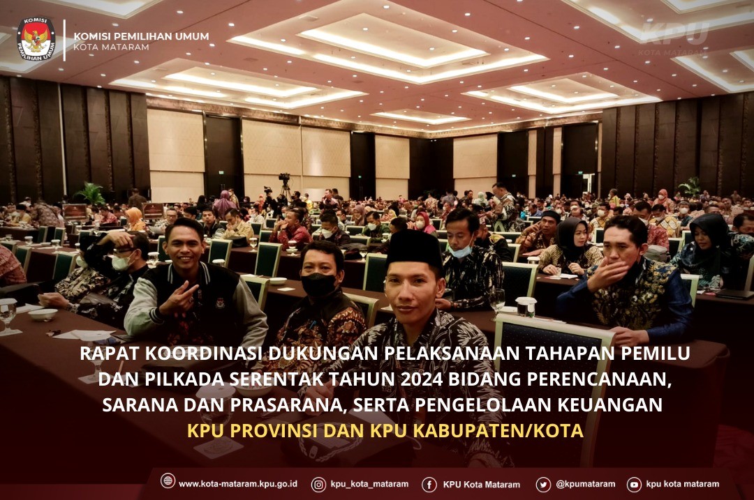 #TemanPemilih, Rabu (24/08) Ketua KPU Kota Mataram, M. Husni Abidin bersama Anggota KPU Kota Mataram Divisi Perencanaan, Data dan Informasi, Edy Putrawan dan didampingi Kepala Sub Bagian Keuangan, Umum dan Logistik, Fitriana Anwar serta Kepala Sub Bagian Perencanaan, Data dan Informasi, Tanti Ujianti Hamim, mengikuti Rapat Koordinasi Dukungan Pelaksanaan Tahapan Pemilu dan Pilkada Serentak Tahun 2024 Bidang Perencanaan, Sarana dan Prasarana, Serta Pengelolaan Keuangan KPU Provinsi/KIP Aceh, KPU/KIP Kabupaten/Kota yang diadakan oleh KPU RI di Hotel Nusa Dua Bali dari tanggal 23 - 25 Agustus 2022.