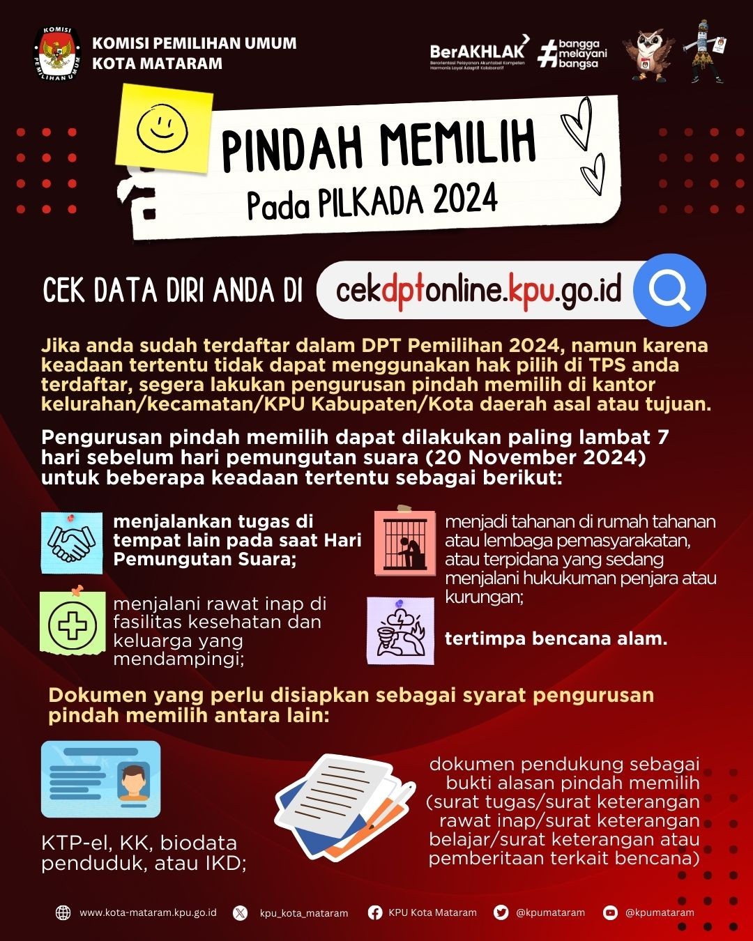 #TemanPemilih, Jika anda telah terdaftar dalam DPT Pemilihan Tahun 2024, namun karena keadaan tertentu tidak dapat menggunakan hak pilih di TPS anda terdaftar, segera lakukan pengurusan pindah memilih di kantor kelurahan/kecamatan/KPU2024 kabupaten/kota daerah asal atau tujuan.
