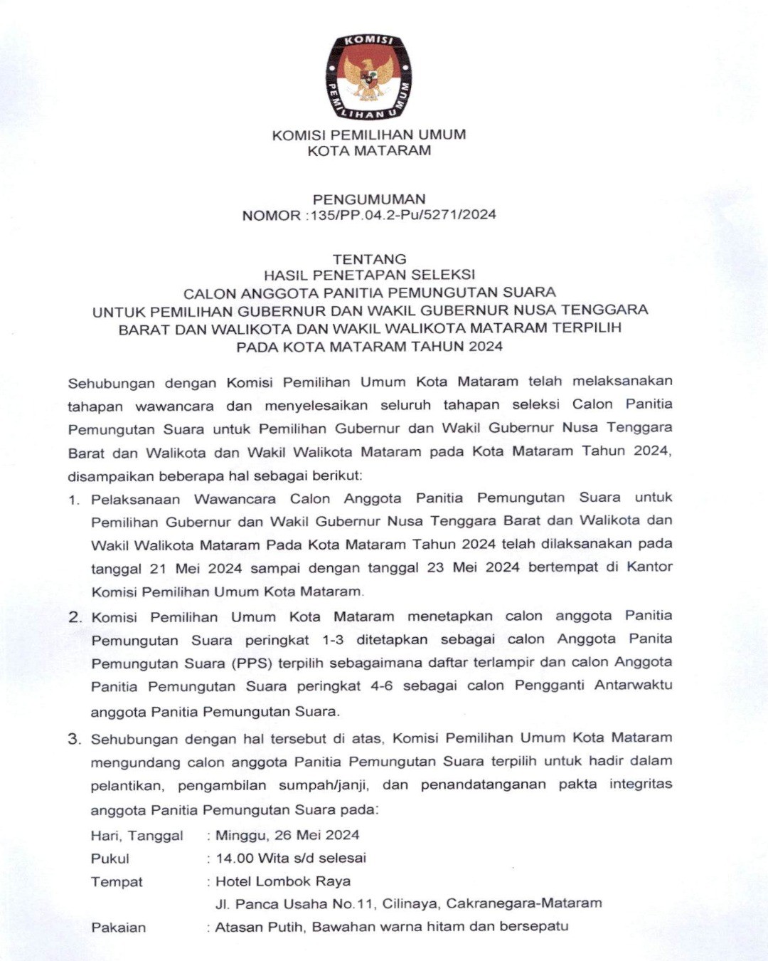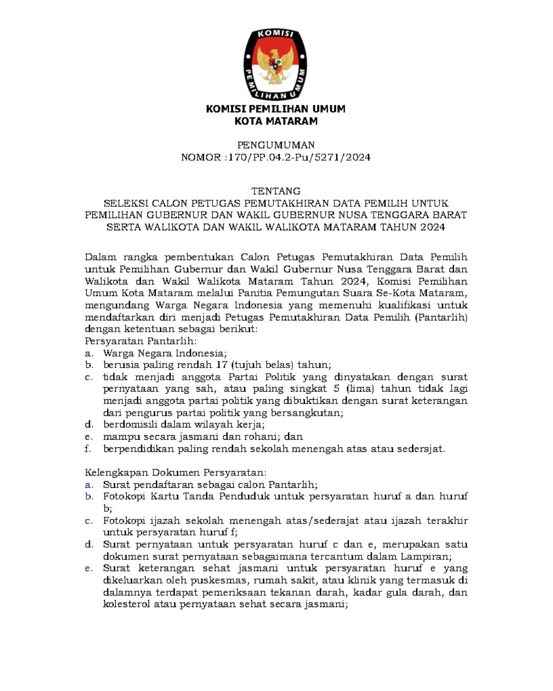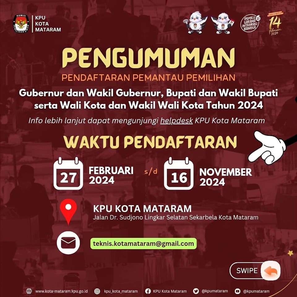 Hai #TemanPemilih, KPU Kota mataram mengajak warga Kota Mataram untuk berpartisipasi dalam Seleksi Calon Anggota Panitia Pemilihan Kecamatan Pemilihan Gubernur dan Wakil Gubernur Nusa Tenggara Barat, Walikota dan Wakil Walikota Mataram Tahun 2024 di wilayah kerja Kota Mataram. Informasi selengkapnya dapat dilihat di :