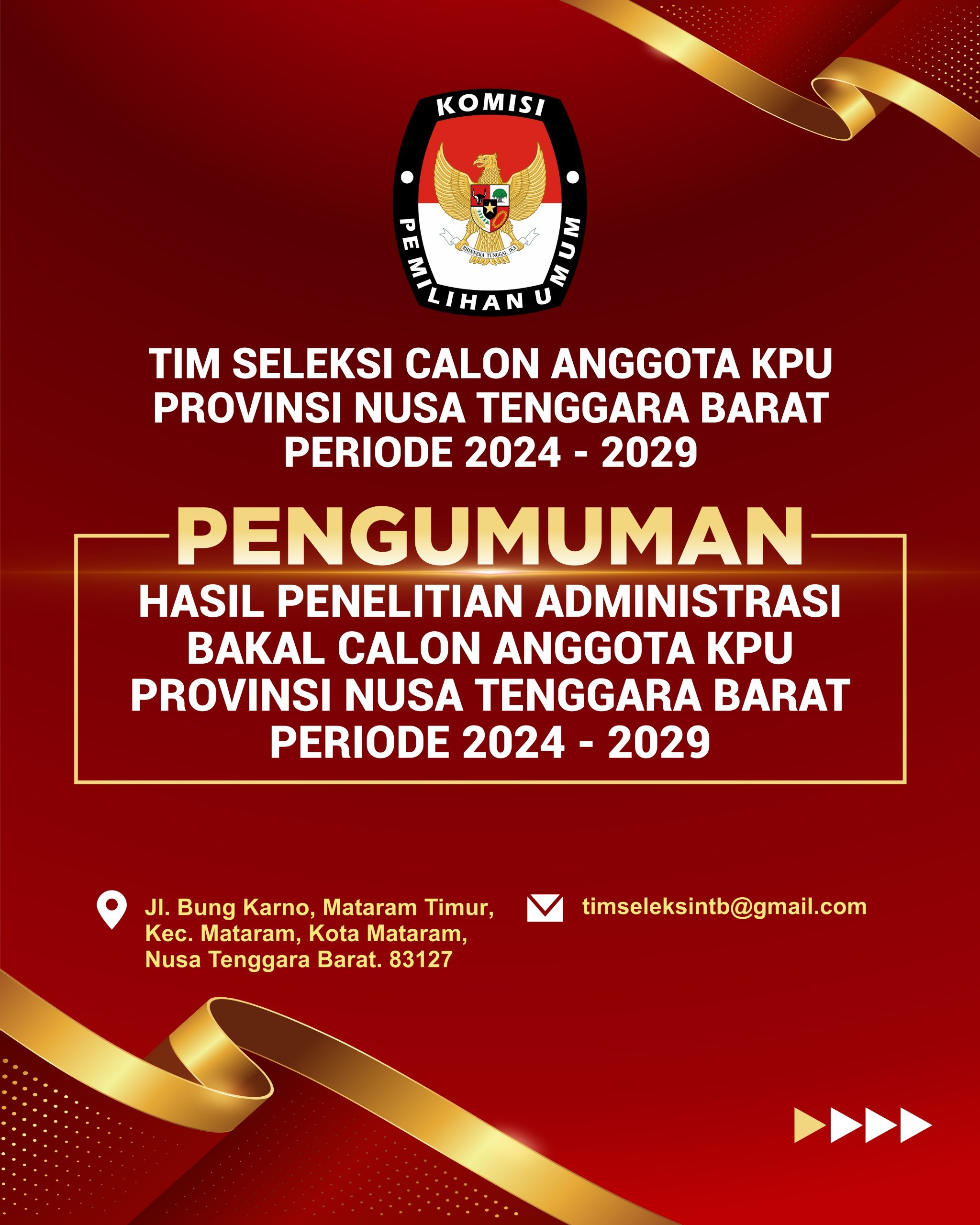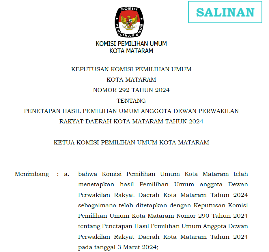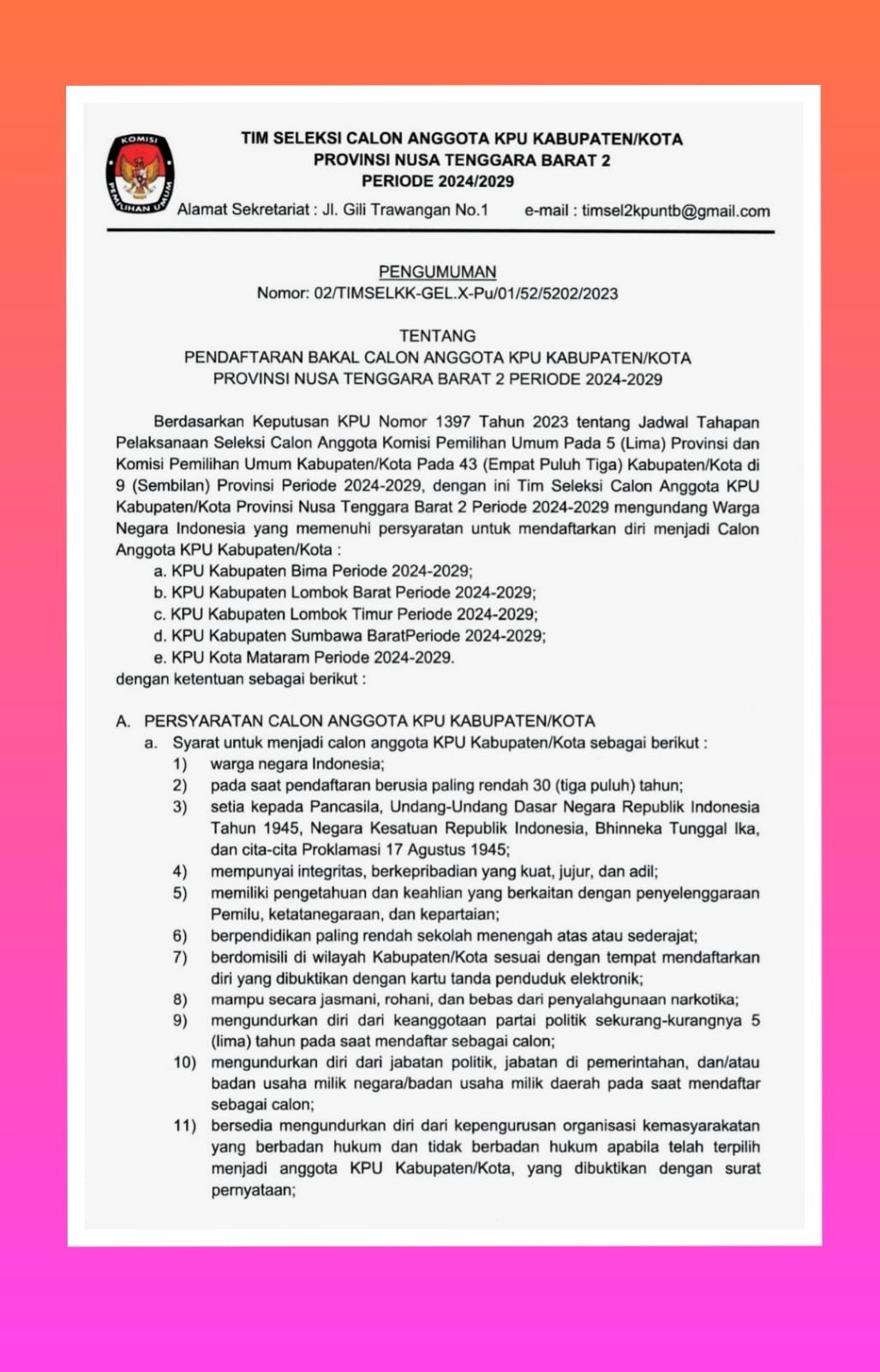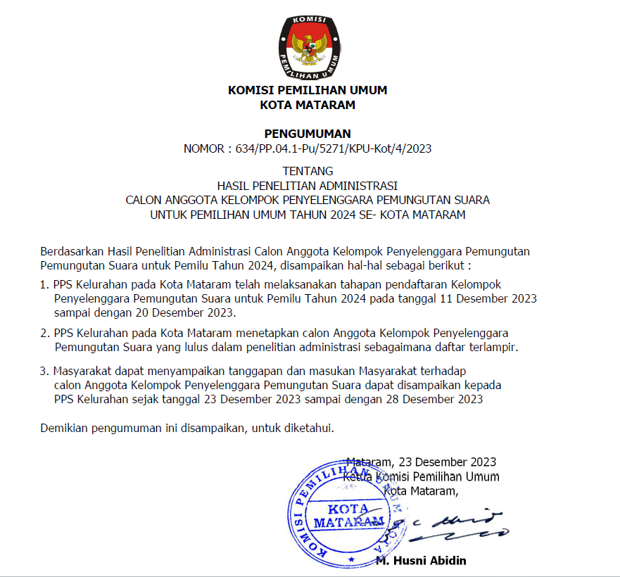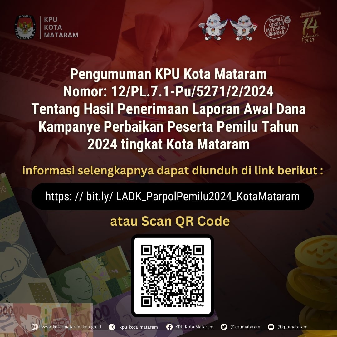 #TemanPemilih, Berikut kami sampaikan Pengumuman KPU Kota Mataram Nomor :12/PL.7.1-Pu/5271/2/2024 Tentang Hasil Penerimaan Laporan Awal Dana Kampanye (LADK) Perbaikan Peserta Pemilihan Umum Tahun 2024 tingkat Kota Mataram.