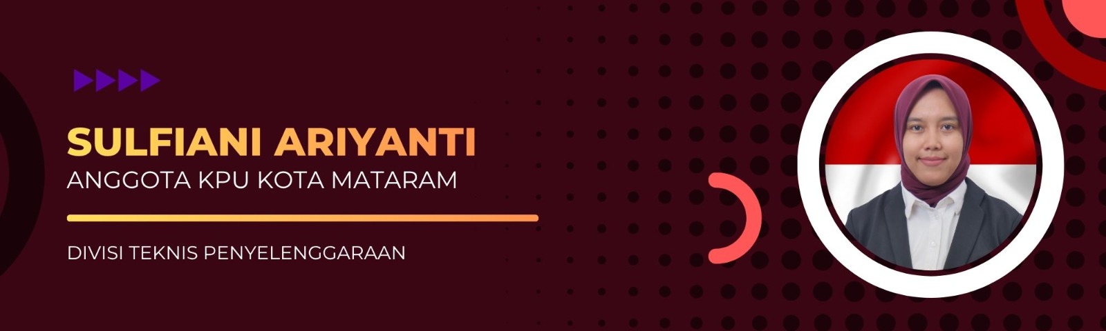 Biodata Diri : Sulfiani Ariyanti lahir di Mataram tahun 1992. Saat ini menjabat sebagai Ketua Divisi Teknis Penyelenggara Pemilu KPU Kota Mataram. Komisioner termuda di KPU Kota Mataram ini menamatkan pendidikan S1 Pendidikan Biologi FKIP Universitas Mataram tahun 2015 dengan predikat cumlaude sehingga berhasil mendapatkan beasiswa unggulan dari kementerian Pendidikan tinggi untuk melanjutkan pendidikan s2 di Universitas Negeri Malang dan berhasil tamat tahun 2018 juga dengan predikat cumlaude.