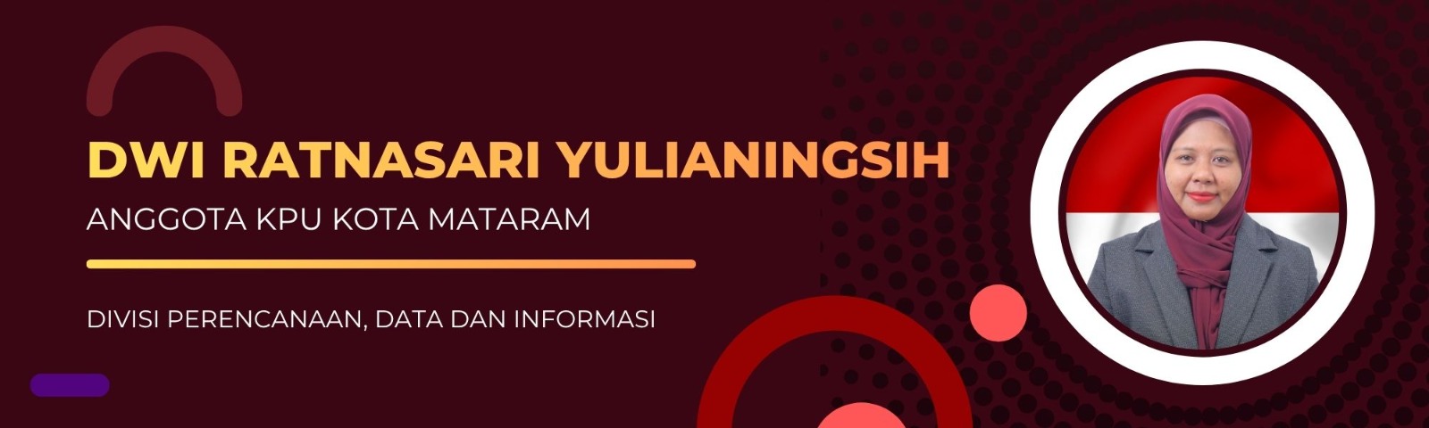 Biodata Diri : Dwi Ratnasari Yulianingsih S saat ini merupakan Ketua Divisi Perencanaan data dan Informasi KPU Kota Mataram. Dwi lahir di Desa Batuyang Kecamatan Pringgabaya berhasil menamatkan pendidikan S1 di IKIP Mataram tahun 2013 kemudian melanjutkan pendidikan master di UIN Mataram jurusan Manajemen Pendidikan Islam dan tamat tahun 2019.
