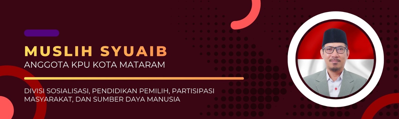 Biodata Diri : Muslih Syuaib saat menjabat sebagai Ketua Divisi Sosialisasi, Pendidikan Pemilih, Partisipasi Masyarakat dan SDM KPU Kota Mataram. Pria kelahiran Jakarta tahun 1978 itu menamatkan pendidikan S1 di Fakultas Teknologi Pertanian Universitas Muhammadiyah Mataram. Saat mahasiswa ia pernah menjabat sebagai Ketua Badan Eksekutif Mahasiswa (BEM) Universitas Muhammadiyah Mataram. Selain aktif di organisasi intrakampus ia juga aktif di sejumlah organisasi ekstra kampus seperti HMI dan IMM. Aktivis Muhammadiyah ini juga pernah menjabat sebagai ketua Pemuda Muhammadiyah Kota Mataram dan Pemuda Muhammadiyah NTB. Sebelum menjadi penyelenggara pemilu, Muslih Syuaib juga aktif di organisasi pemantau dan pendidikan pemilih, salah satunya sebagai Sekprov Jaringan Pendidikan Pemilih untuk Rakyat (JPPR) NTB.